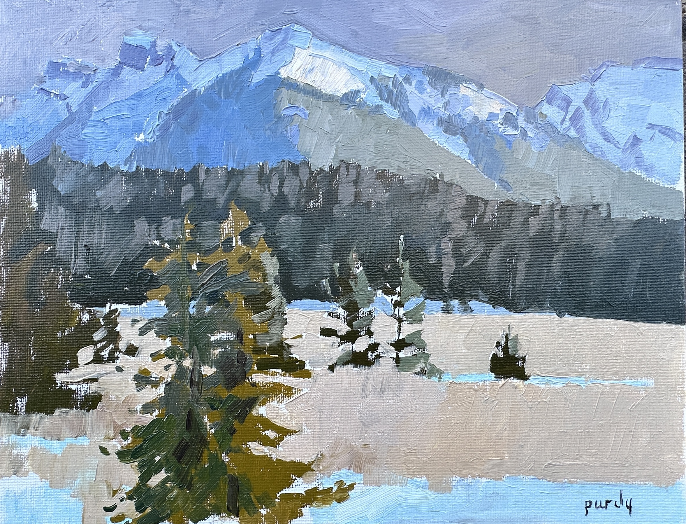 It is cold December morning in Banff. The sun is doing its best to shine through the ice crystals, illuminating the nearby field and trees. The distant mountains are majestic as they come to life, touched by sunlight.
